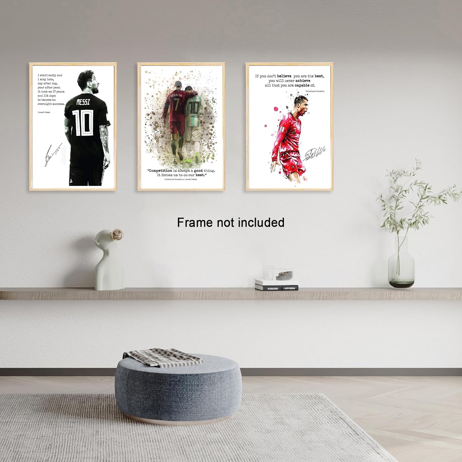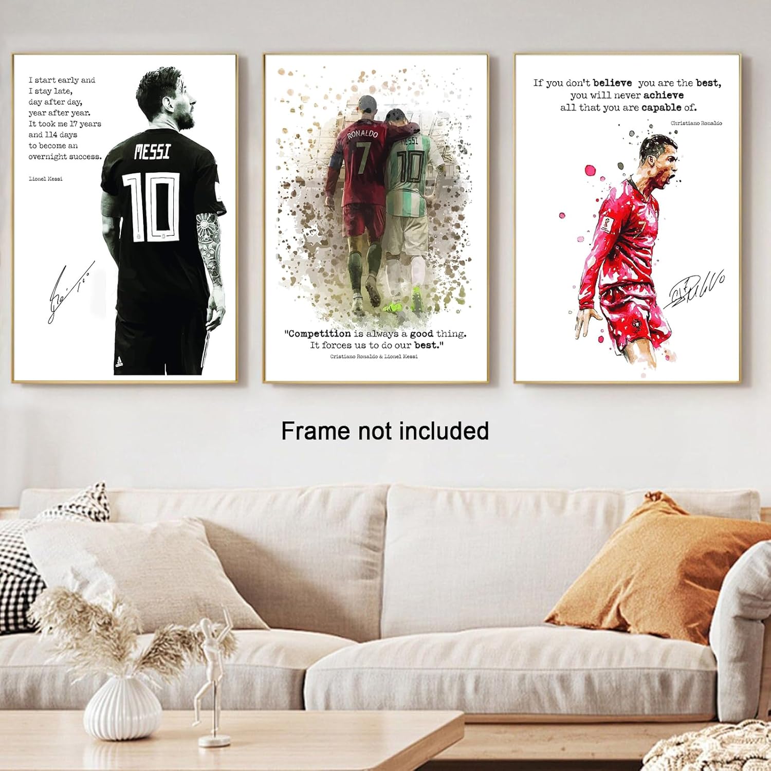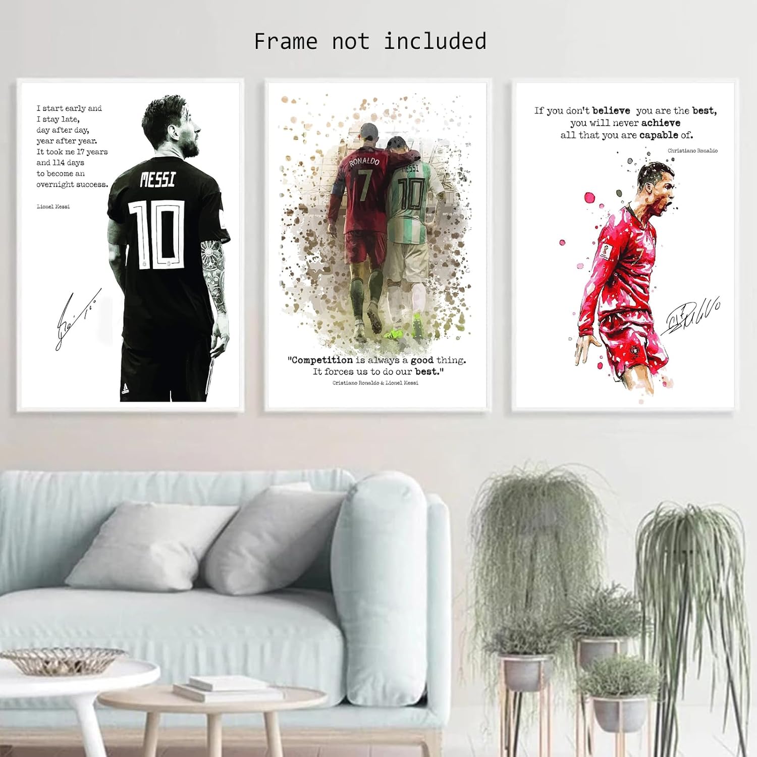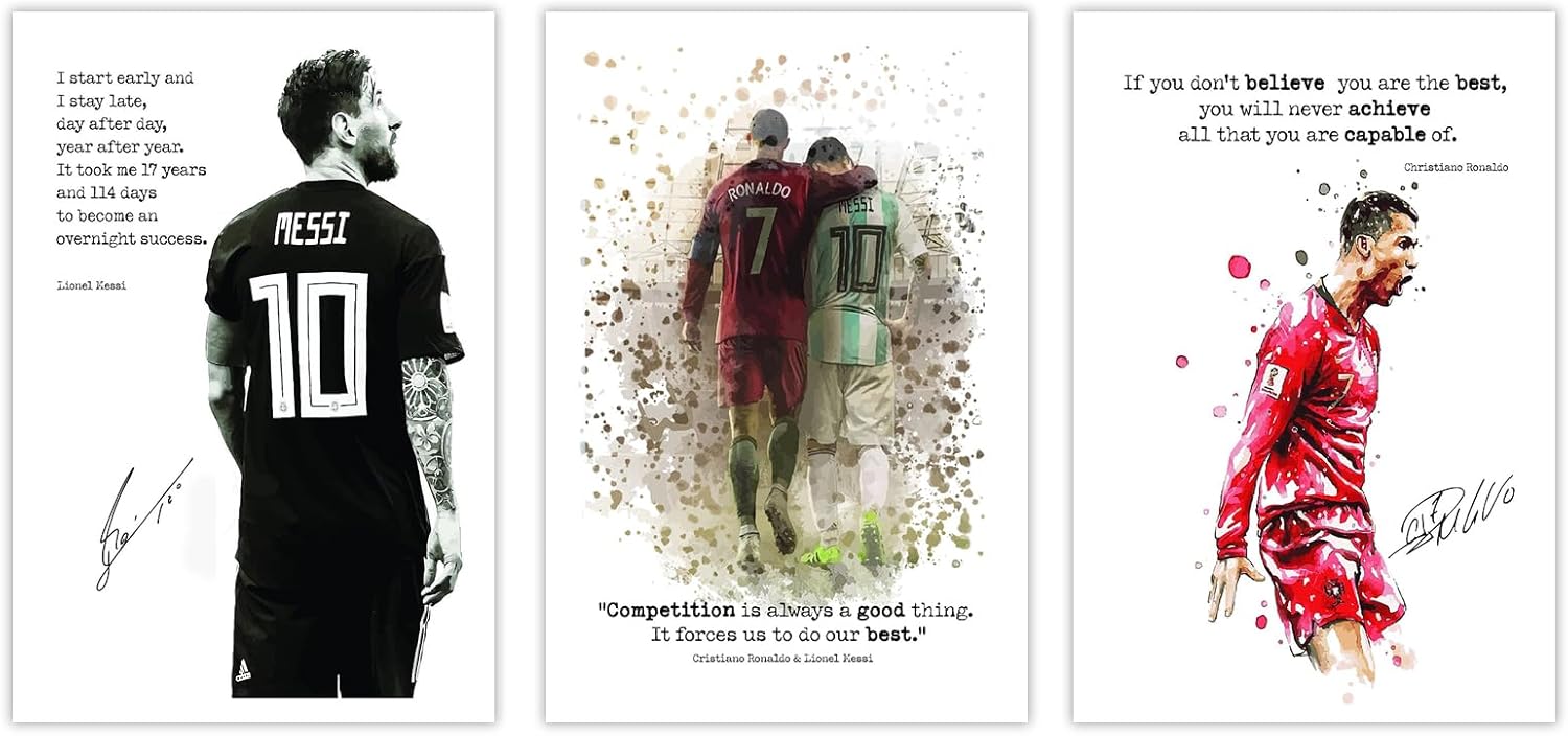 Generic Messi And Ronaldo Posters for Boys Bedroom Motivational Soccer Superstar Canvas Wall Art Set of 3 Sports Themed Wall Decor for Livingroom Fans Gift 8x12 inch Unframed