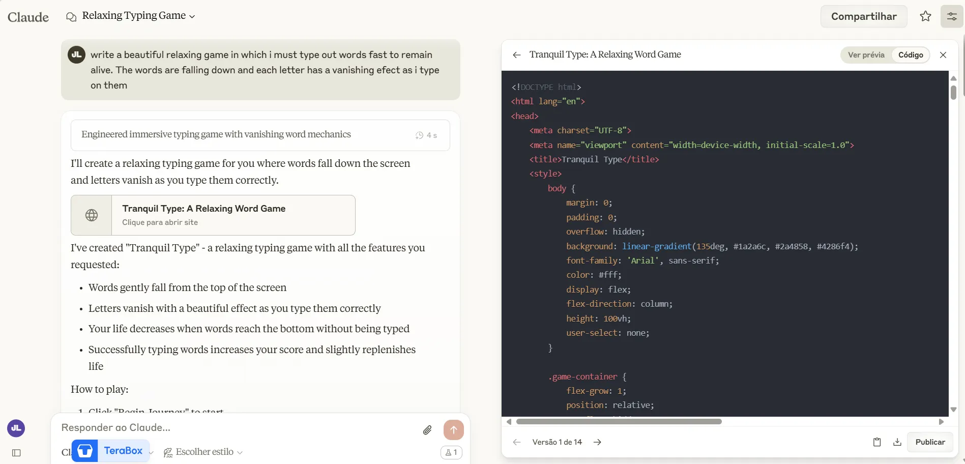 We started with the most basic prompt possible: "Write a beautiful, relaxing game in which I must type out words fast to remain alive. The words are falling down and each letter has a vanishing effect as I type on them."